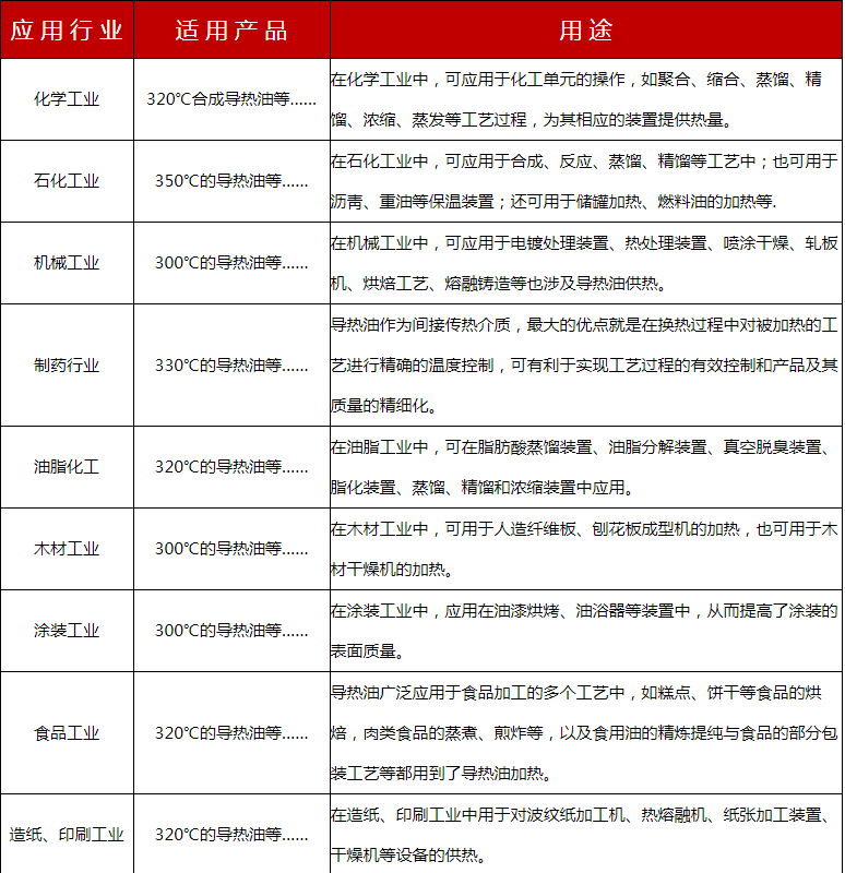 不同的行業(yè),適用于不同的合成導熱油,讓我們一起看看它們的各自用途: